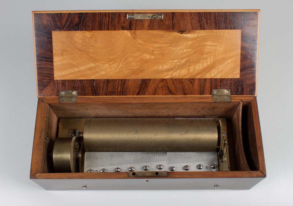 5 Musikdose «Alexandra No. 7». Alfred Junod, Ste-Croix um 1895. — Auswechselbare Zylinderhülsen mit je 6 Musikstücken; Stimmkamm mit 41 Tönen.