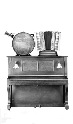 • ein selbstspielendes Akkordeon begleitet von Klavier, Pauke, Trommel und Cinelle - in Form eines Seybold-Orchestrions aus den 1920er Jahren