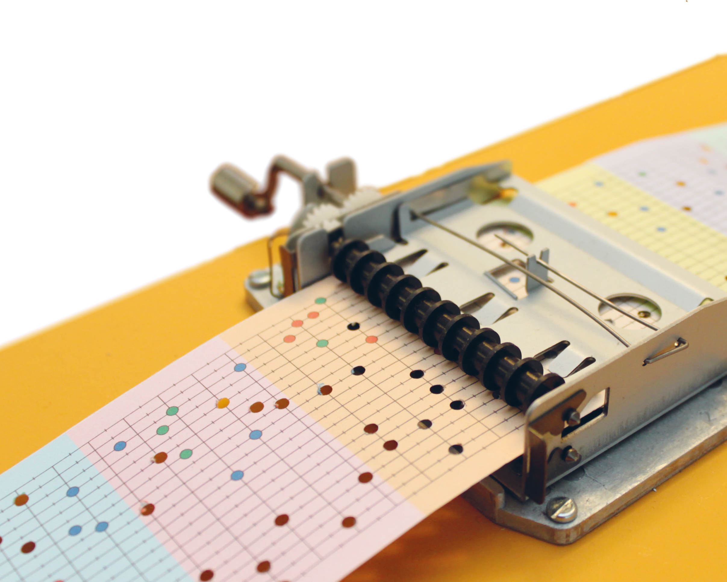 Les enfants consignent la solution à chacune des dix questions du jeu « Découvre la mélodie ! » en perforant eux-mêmes une bande musicale et, à la fin, découvrent la mélodie à l’aide d’une boîte à musique. Ils mettent ainsi en œuvre une technique de mémorisation de mélodies vieille de plusieurs siècles.